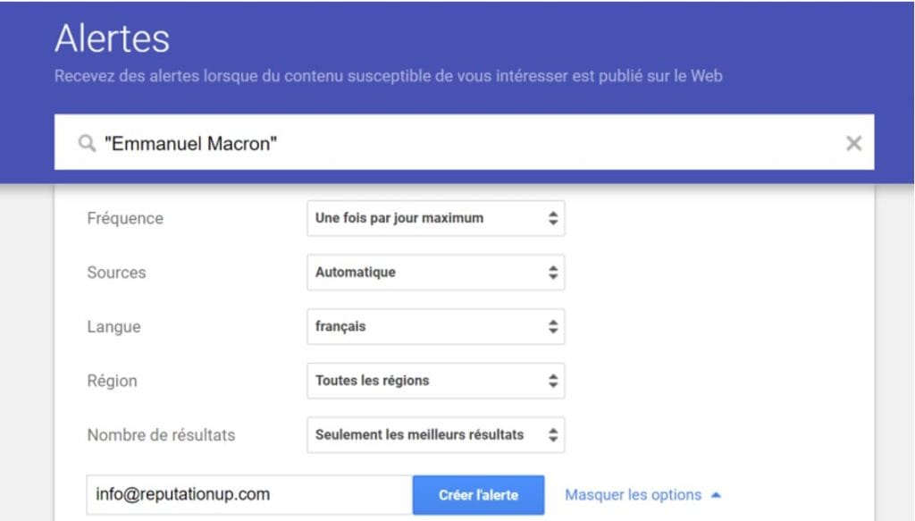- Google Alertes : sans conteste l’outil le plus accessible et simple à comprendre pour surveiller son e-réputation. Selon les paramètres et le mot-clé défini lors de la création de compte Google, vous recevrez une alerte à chaque fois que ce dernier sera référencé en ligne.